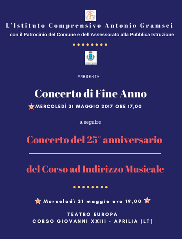 Domani alle 17.00 al Teatro Europa di Aprilia il tradizionale “Concerto di Fine Anno” degli alunni del Corso ad Indirizzo Musicale dell’Istituto Comprensivo “Gramsci”. A seguire, alle 19.00. ci sarà...
