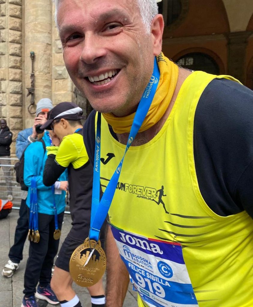 Stesso giorno ma altra località: Bologna. E’ lì che il nostro Felice Sibilla, dopo un’estenuante preparazione atletica durata mesi, ha deciso di affrontare la sua seconda Maratona. 42,175 km nella splendida città piena di storia, di arte che ha accolto i 1144 podisti e podiste che hanno affrontato la regina delle distanze. Felice ha concluso con successo la sua gara classificandosi al 659° posto fissando il cronometro a 4h 05’ 12” in real time.