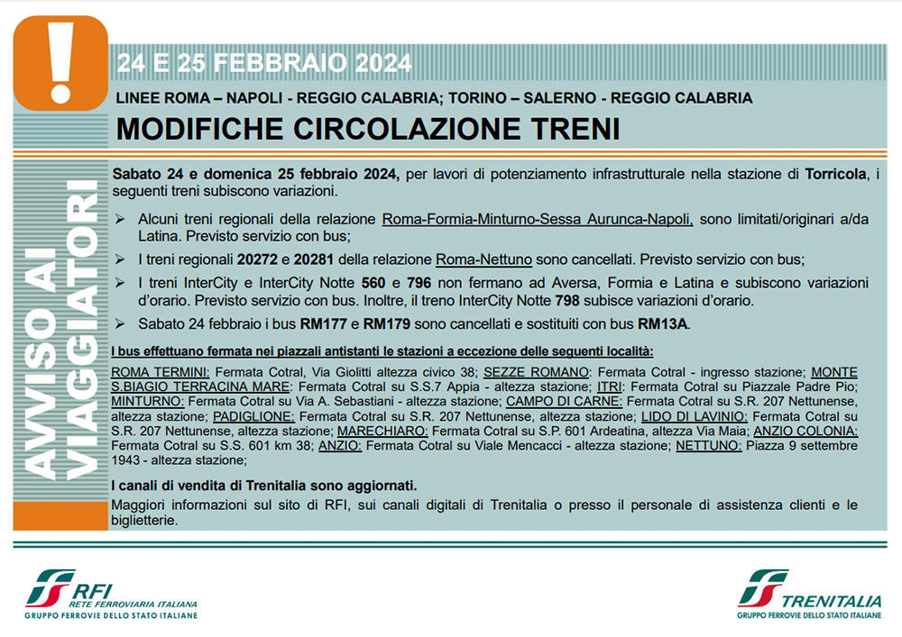 I treni InterCity e InterCity Notte 560 e 796 non fermano ad Aversa, Formia e Latina e subiscono variazioni d’orario. Previsto servizio con bus. Inoltre, il treno InterCity Notte 798 subisce variazioni d’orario.
