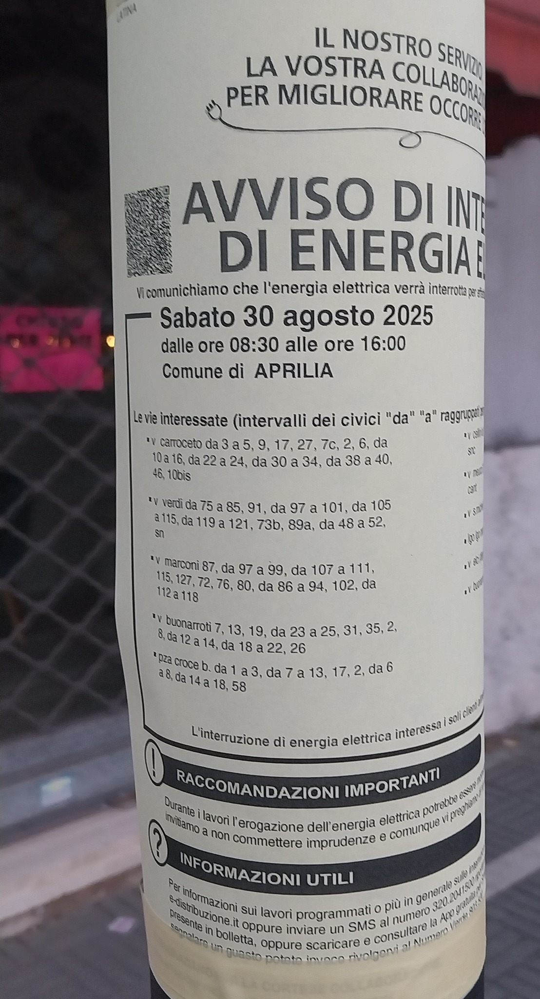 Molte strade del centro di Aprilia questo sabato senza corrente per 8 ore.