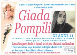 Si terranno domani, mercoledì 25 giugno, i funerali di Giada Pompili, la ragazzina di 11 anni trovata priva di sensi in mare a Terracina una settimana fa. Le esequie sono previste alle 16 presso il Santuario Santa Maria a Fiume a Ceccano, la camera ardente è stata allestita presso l’ospedale Pediatrico Bambino Gesù di Roma. La ragazzina venne stata ritrovata in mare, svenuta, da due pescatori dopo essere stata travolta da un'onda. Soccorsa dal 118 venne condotta d’urgenza nella capitale. La famiglia ha deciso di donare gli organi della piccola.