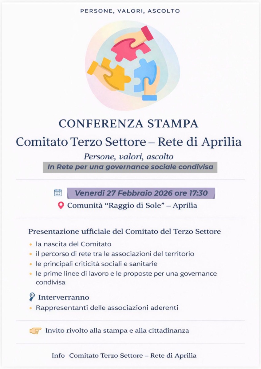 Si presenta alla città il Comitato Terzo Settore - Rete di Aprilia. Un incontro si terrà venerdì 27 febbraio alle 17.30 presso la Comunità “Raggio di Sole” – Aprilia. La presidente è Valentina Tartaglia.