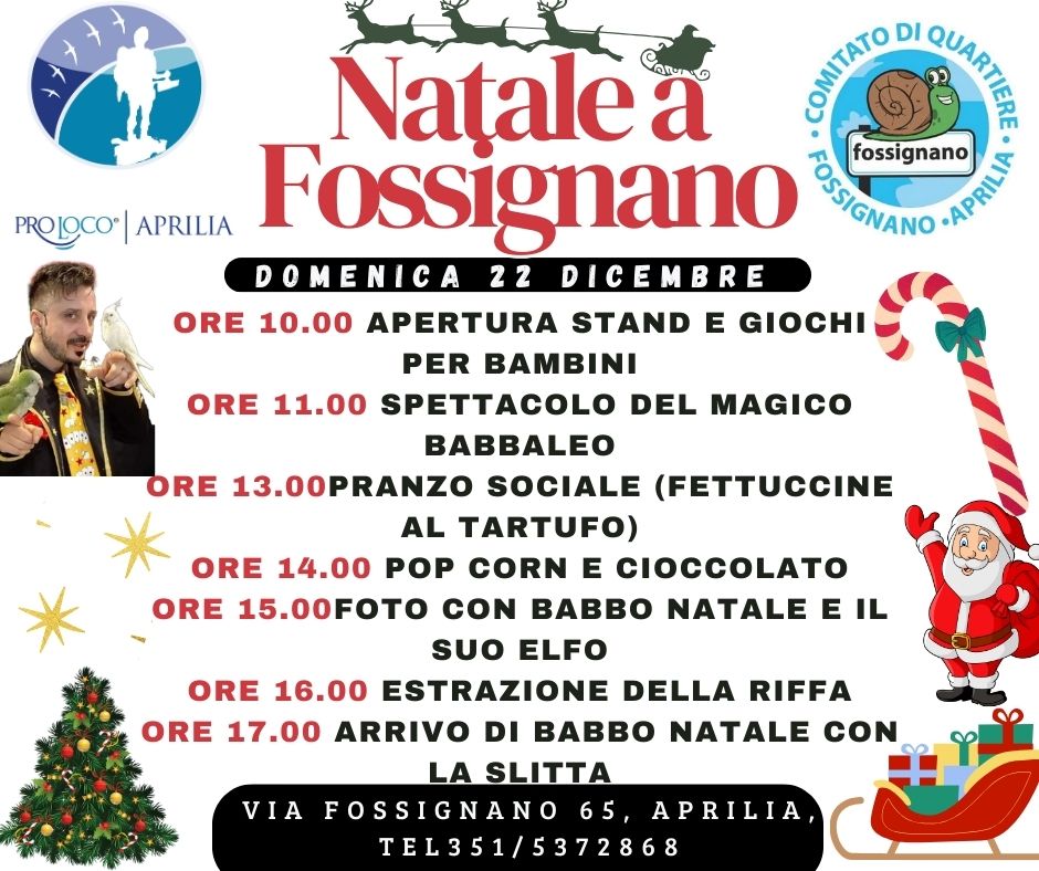 “Natale a Fossignano”: questa domenica 22 Dicembre nel quartiere periferico di Aprilia ci sarà una nuova giornata di eventi. Presso la sede del Comitato di Quartiere, alle 11.00, arriverà il “Magico Babbaleo”, che si esibirà in uno spettacolo di magia. Ci sarà poi un pranzo sociale, con fettuccine al tartufo. Nel pomeriggio foto con Babbo Natale ed il suo Elfo e all’imbrunire Babbo Natale farà fare un giro a tutti i bambini sulla sua slitta illuminata, all'interno del piazzale del Comitato.