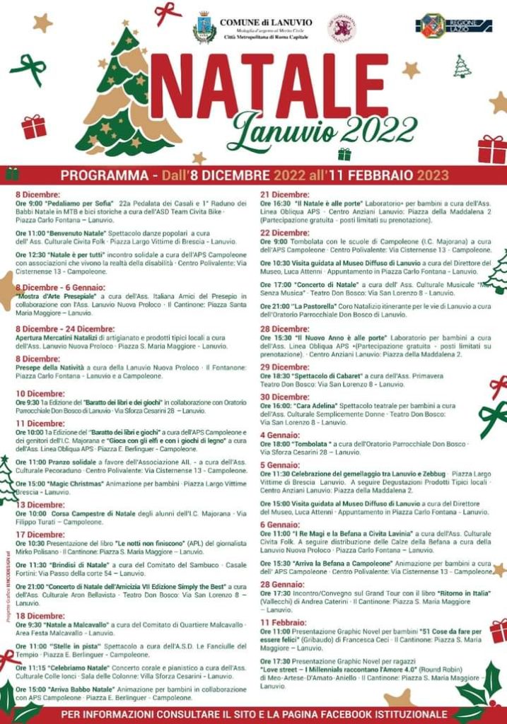 Natale a Lanuvio, il calendario di eventi si apre questo giovedì 8 Dicembre, con l’apertura dei mercatini natalizi artigianali, della mostra dei presepi, e con l’iniziativa “Pedalata per Sofia” che prenderà il via alle 9.00 del mattino con un raduno di Babbi Natale in bici in Piazza Carlo Fontana. Alle 11.00 ci sarà anche uno spettacolo di danze popolari in Piazza Largo Vittime di Brescia.
