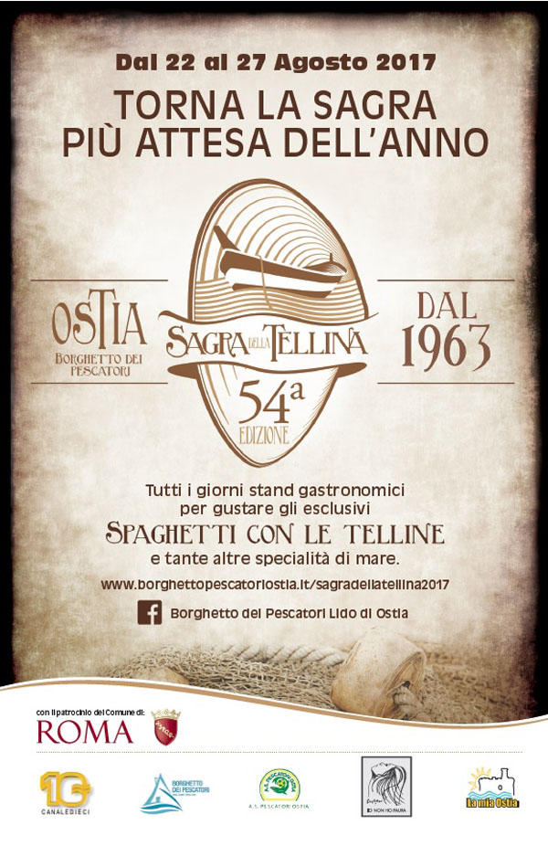 Gli spaghetti con le telline rappresentano uno dei piatti tipici della cucina capitolina e un vanto per quella ostiense. Una ricetta semplice, con pochi ingredienti, compreso il prelibato mollusco che sulle tavole della Sagra fa la parte del leone. Uno dei piatti più amati dai romani e dai turisti in vacanza sul mare di Roma. Per l’intera manifestazione, presso il campo sportivo sarà allestito un mercatino di artigianato e delizie di produzione regionale e locale, per scoprire e assaporare tutto il meglio della regione. Non mancheranno occasioni per divertirsi e ballare insieme: ad accompagnare la sagra, un fitto calendario di appuntamenti con cabaret e concerti sotto le stelle, dibattiti e balli di gruppo. La sagra quest'anno si avvale dell'amichevole conduzione di Elisa Palchetti e la partecipazione di Aldo Marinelli de La mia Ostia, periodico locale.