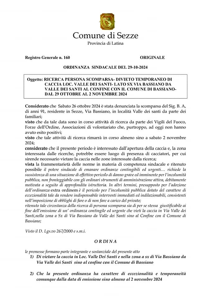 Ancora nessuna notizia del 91enne di Sezze Augusto Battaglini, scomparso lo scorso sabato 26 Ottobre. Di lui non si è trovata traccia, dopo che al mattino è uscito di casa, nella zona di Crocemoschitto, per andare a cercare funghi in un bosco. Il sindaco Lidano Lucidi, ieri, per agevolare le ricerche, ha firmato un’ordinanza di divieto di caccia nella zona Valle dei Santi-Via Bassiano. I familiari dell’anziano sono rivolti anche alla trasmissione Rai “Chi l’ha Visto?”.