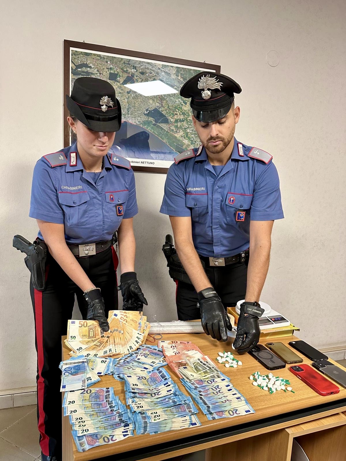 Una busta di cocaina occultata nel soffitto di un androne, poi il prelievo e gli arresti in flagranza di reato. In una zona residenziale di Nettuno i Carabinieri, nel corso di un blitz, sono riusciti a mettere in manette due persone, un 22enne ed un 52enne e a recuperare in casa del più giovane la somma contante di 8.290 euro ed il materiale per confezionare e dosare lo stupefacente.