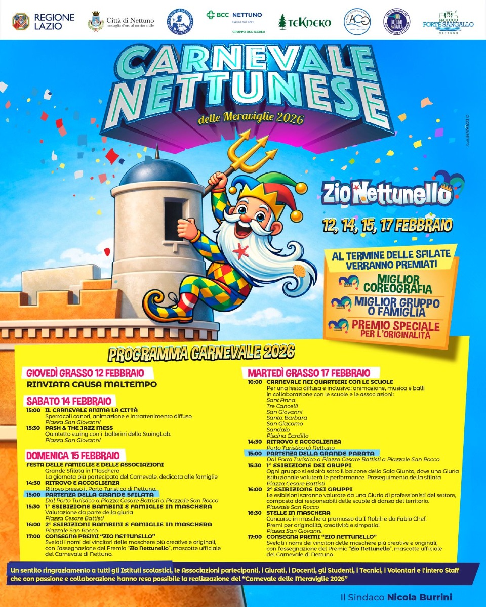 Nettuno, rinviata la sfilata di Carnevale che era prevista per questo giovedì grasso. A causa delle avverse condizioni meteo, la parata è stata posticipata a martedì 17 febbraio. Alle 10.00 del mattino ci sarà il Carnevale nei quartieri, con le scuole. Alle 15.30 la parata penderà il via dal Porto Turistico.