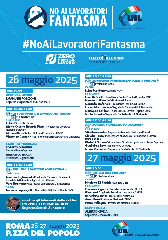 Il 27 maggio spazio invece ai servizi alle persone, che la Uil offre attraverso le sue innumerevoli sedi dislocate su tutto il territorio laziale. Molti i rappresentanti istituzionali e sindacali che si alterneranno sul palco. Dal sindaco di Roma al presidente della Regione Lazio, da docenti universitari al presidente della camera di commercio di Roma, dal presidente C.I.V Inail al Segretario generale Uil Pierpaolo Bombardieri.