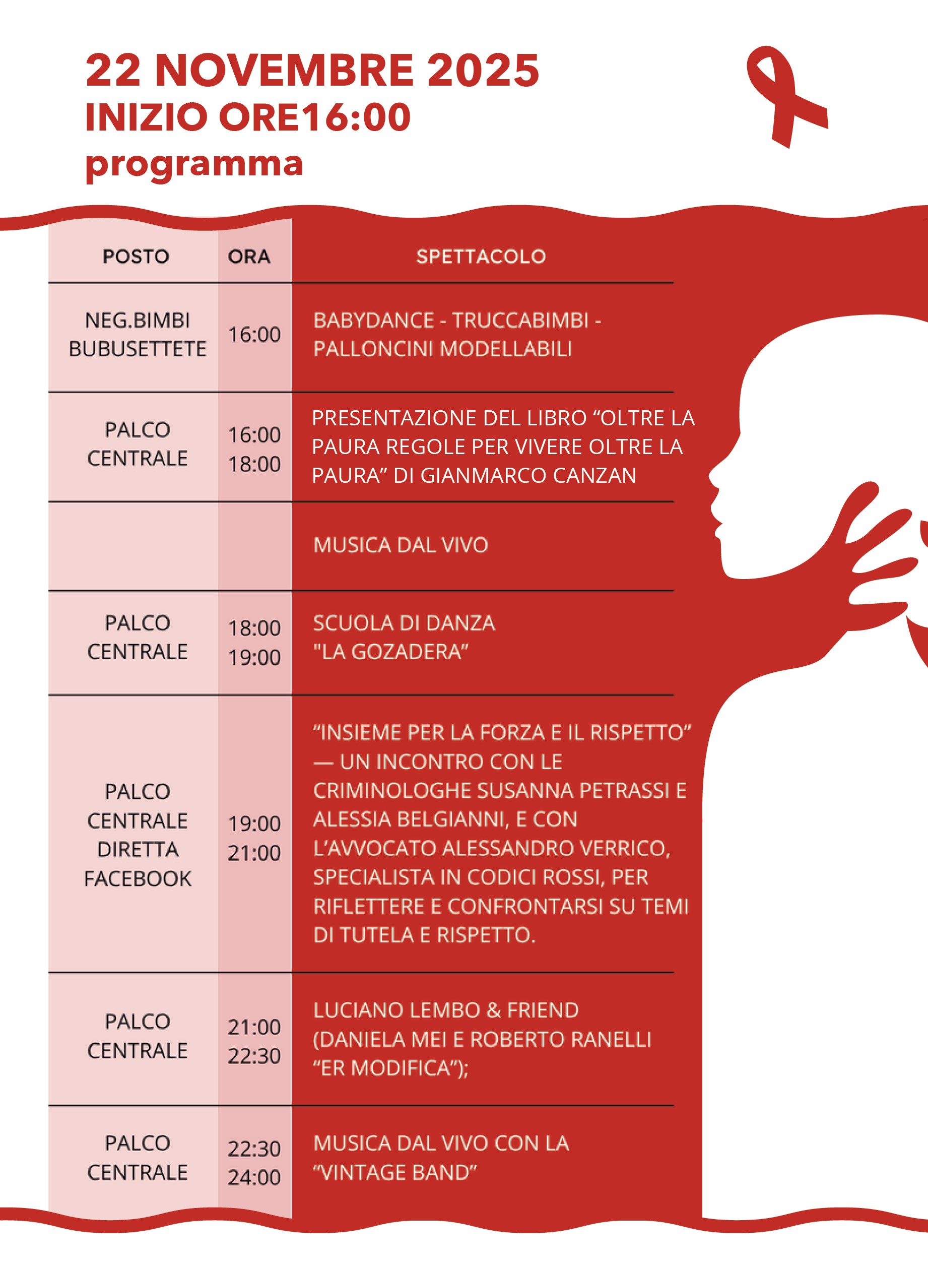 Nell’area chiusa al traffico veicolare si svolgerà anche la presentazione del libro “Oltre la paura – Regole per vivere oltre la paura” di Gianmarco Canzan, un momento di riflessione e confronto che segna simbolicamente il valore culturale e sociale dell'intera iniziativa, mentre il tema guida dell’evento, “Insieme per la forza e il rispetto”, troverà il suo fulcro nel tavolo tematico in programma dalle 19:00 alle 21:00 sul palco centrale (con diretta Facebook).
