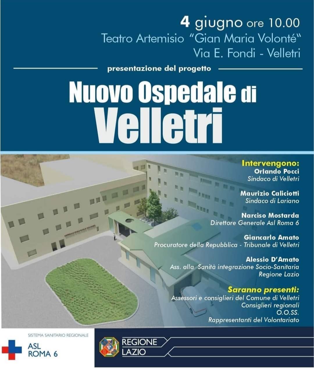 Sarà presentato domani mattina alle 10, presso il teatro Artemisio "Gian Maria Volontè" a Velletri il progetto del nuovo ospedale. Ci saranno gli interventi dei sindaci di Velletri e Lariano, ma anche quello del direttore generale della Asl Roma 6, Narciso Mostarda, il Procuratore della Repubblica Giancarlo Amato e l'assessore alla Sanità della Regione Alessio D'Amato.