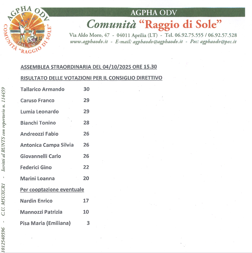 Nuovo presidente e nuovo direttivo per l’Agpha di Aprilia, l’associazione dei portatori di handicap che da anni ormai si occupa di portare avanti la “Comunità Raggio di Sole” di via Aldo Moro. Nell’assemblea del 4 ottobre scorso è stato nominato presidente Armando Tallarico, il vice presidente sarà Gino Federico, il segretario Leonardo Lumia, infine il tesoriere Tonino Bianchi. Per Tallarico in realtà non si tratta di un nuovo incarico, fu padre costituente dell'Agpha e per molto tempo anche presidente dell'associazione.