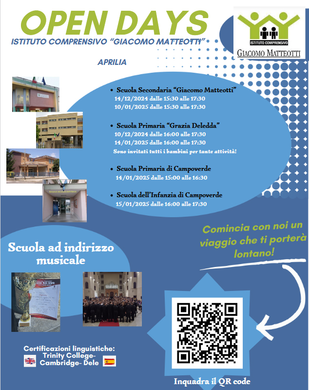 Open Day anche per l’Istituto Comprensivo Matteotti. Il 10 dicembre si aprono le porte della scuola Deledda dalle 16 alle 17.30. Il 14 dicembre appuntamento dalle 15.30 alle 17.30 presso l’Istituto di via Respighi.