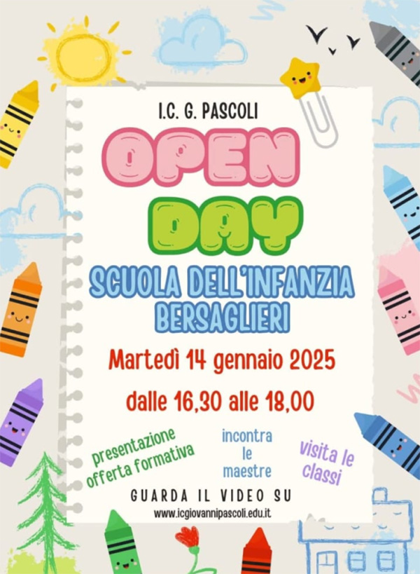 Si parte martedì 14 gennaio all’Istituto “Pascoli”: le maestre della scuola dell’Infanzia “Bersaglieri” di via Bersaglieri, dalle 16.30 alle 18.00, aprono le porte per accogliere genitori e bambini.
