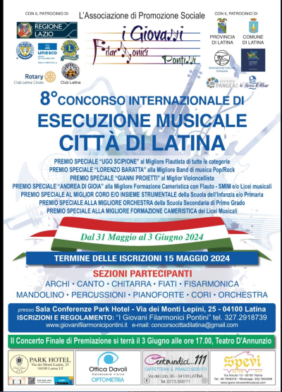Dal 31 maggio al 03 giugno 2024 si è svolto l’8° Concorso Internazionale di Esecuzione Musicale Città di Latina, un concorso nato con l’intento di promuovere il confronto fra giovani musicisti che, in un clima di dialogo e scambio culturale, possono sviluppare le risorse del nostro territorio avvicinando l’emozione e la tensione dell’artista, alla fiducia e alla curiosità del pubblico. Si svolge ogni anno e vede la partecipazione di talenti di ogni nazionalità.