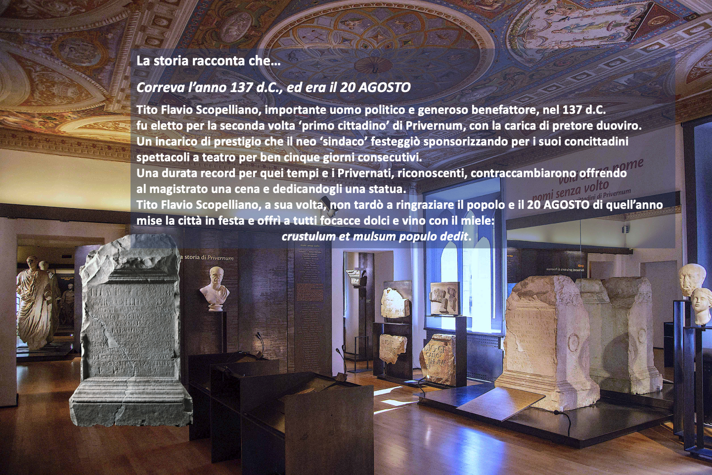 Tito Flavio Scopelliano, a sua volta, non tardò a ringraziare il popolo e il 20 AGOSTO di quell’anno mise la città in festa e offrì a tutti focacce dolci e vino con il miele: crustulum et mulsumpopulodedit.