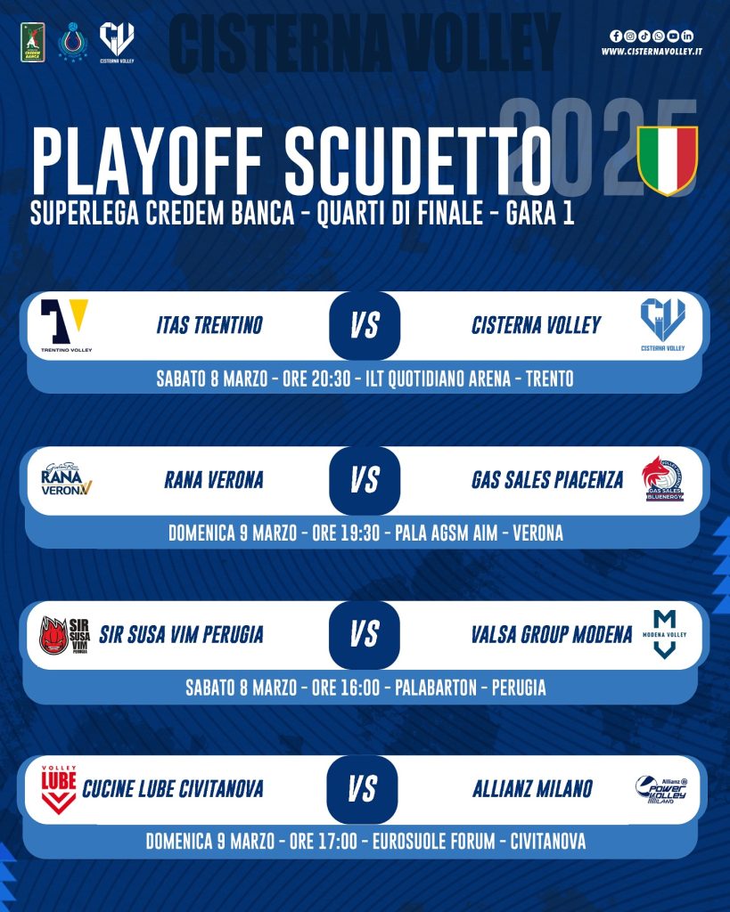 Pallavolo di Superlega, il Cisterna Volley si prepara a una sfida di grande prestigio nei quarti di finale dei playoff scudetto. Questo sabato 8 Marzo, alle 20.30, al “T Quotidiano Arena” di Trento, affronterà nella gara 1 i locali dell’Itas Trentino, squadra dominatrice della stagione regolare. Domenica 16 Marzo, alle 18.00, andrà poi in scena la gara 2: Cisterna ospiterà l'Itas Trentino al Palasport di via delle Province.