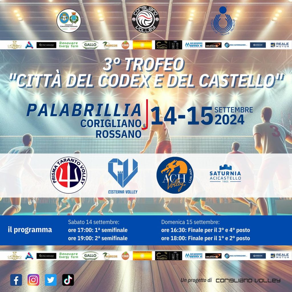 Pallavolo, la Superlega è ormai alle porte. Il Cisterna Volley prosegue la sua preparazione e questo weekend, sabato 14 e domenica 15 Settembre, sarà a Corigliano Calabro per partecipare alla terza edizione del “Torneo del Codex e del Castello”. I pontini scenderanno in campo - al “Palabirilla” di Corigliano-Rossano - contro 3 protagoniste del volley: il Prisma Taranto, il Saturnia Acicastello e la formazione slovena dell’ ACH Volley Ljubljana.