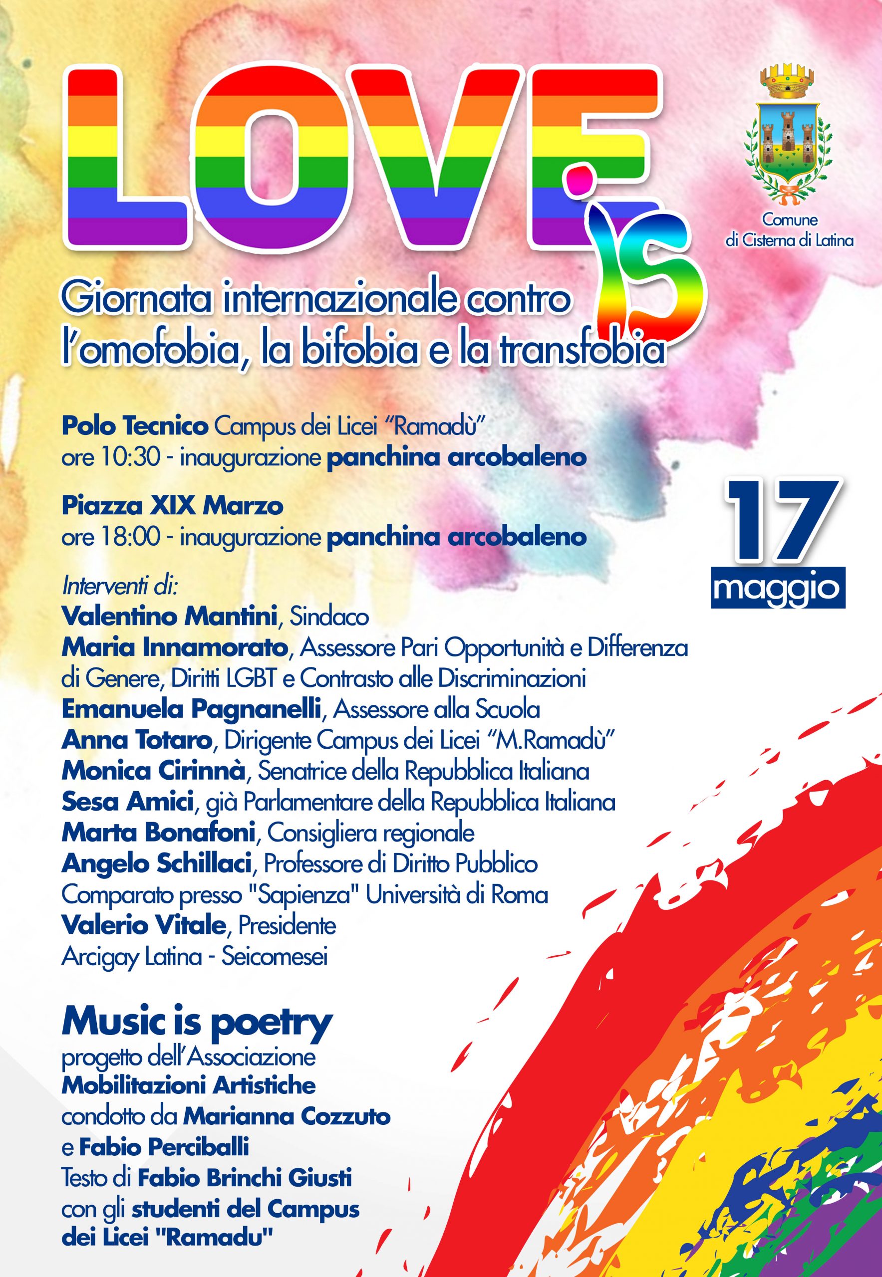 Due panchine e strisce pedonali arcobaleno a Cisterna per la Giornata contro l’omofobia, la bifobia, la trans fobia. L’inaugurazione avverrà domani, martedì 17 maggio, alle 10.30 e a seguire alle 18.00 alla presenza della senatrice Monica Cirinnà, della consigliera regionale Marta Bonafoni. Ci saranno, inoltre, il professore di diritto comparato alla Sapienza, Angelo Schillaci, ed il presidente di Arcigay Latina Valerio Vitale.