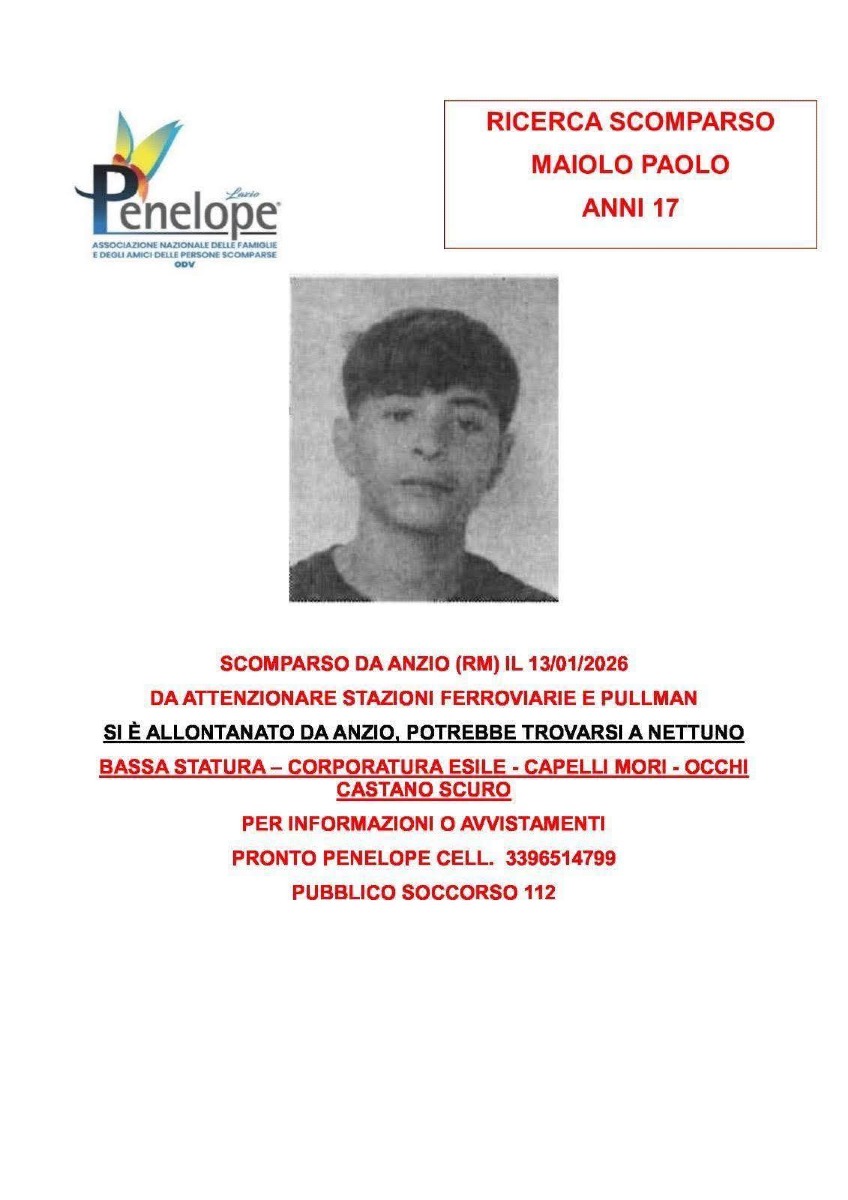 Paolo Maiolo, 17 anni, è scomparso da Anzio dallo scorso 13 gennaio. I familiari e le forze dell’ordine lanciano un appello affinché venga ritrovato, attraverso il Comitato Scientifico Ricerca Scomparsi e l’organizzazione di volontariato Penelope Lazio. Il ragazzo, ancora minorenne potrebbe trovarsi in zona, probabilmente a Nettuno, ma ancora non è stata trovata traccia e sono passati, ormai più di 15 giorni. Sono già state passate al setaccio le stazioni dei treni e dei pullman delle cittadini limitrofe. Paolo Maiolo è di bassa statura e di corporatura esile, ha i capelli mori e gli occhi castano scuro.