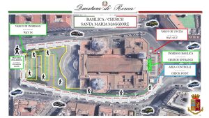 Al fine di gestire i flussi di ingresso in incremento, è stata pianificata la perimetrazione con dispositivi di transennamento mobile lungo tutto il perimetro di piazza dell’Esquilino, utilizzata come bacino di compensazione per i fedeli in attesa, con sistemi di incanalamento destinati ad indirizzare le persone verso i varchi di filtraggio, pur preservando spazi di agibilità e piani di calpestio per i pedoni.