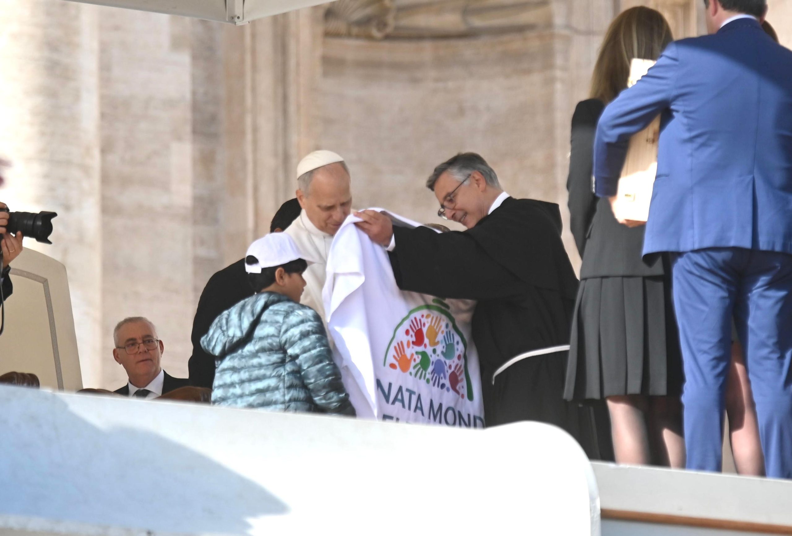 Al termine dell’Udienza, il piccolo MajdBernard, di 7 anni proveniente da Gaza, e padre Enzo Fortunato hanno presentato e mostrato al Papa la bandiera con il logo ufficiale della prossima edizione della Giornata Mondiale dei Bambini. Il Santo Padre ha poi benedetto e firmato la bandiera, divenuta così simbolo del cammino che condurrà all’appuntamento del 2026.