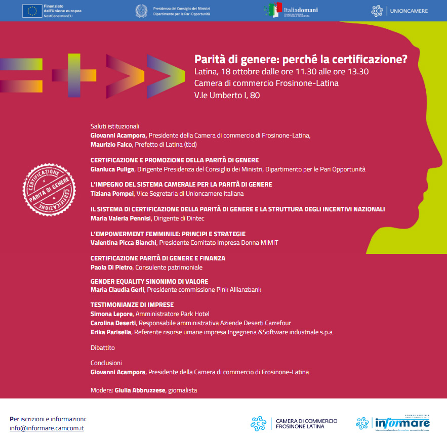 “Parità di genere: perché la certificazione?”: questo mercoledì a Latina l’incontro promosso dalla Camera di Commercio.