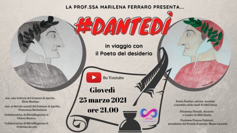 Parte da Aprilia e si espande in tutta Italia l’evento in diretta #Dantedì - in viaggio con il Poeta del desiderio” organizzato da Marilena Ferraro.