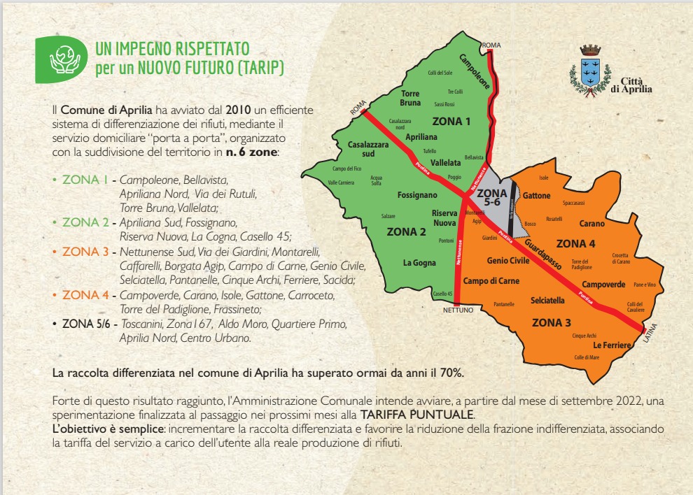 La sperimentazione riguarderà solo 2 delle 6 zone. Gli operatori impiegati saranno 14, suddivisi in 11 squadre di raccolta. Il territorio individuato per la prima fase di sperimentazione è quello identificato con le attuali Zona 1 e Zona 2, nelle quali risiedono 7426 nuclei familiari, per un totale di 17712 cittadini. (Zona 1: Fossignano, La Cogna, Casalazzara e via Riserva Nuova. Zona 2: Apriliana, Vallelata e Campoleone). In sostanza meno rifiuti indifferenziati vengono prodotti più salvaguardiamo il territorio. Con il passaggio alla tariffa puntuale i vantaggi sono molteplici:si rispettano gli obiettivi indicati dall’Unione Europea, si aumenta la percentuale di raccolta differenziata dei rifiuti e una sensibile riduzione dei costi di smaltimento, si riduce sempre più la quantità di rifiuti prodotti pro-capite, si consente un migliore monitoraggio del servizio offerto dal gestore.