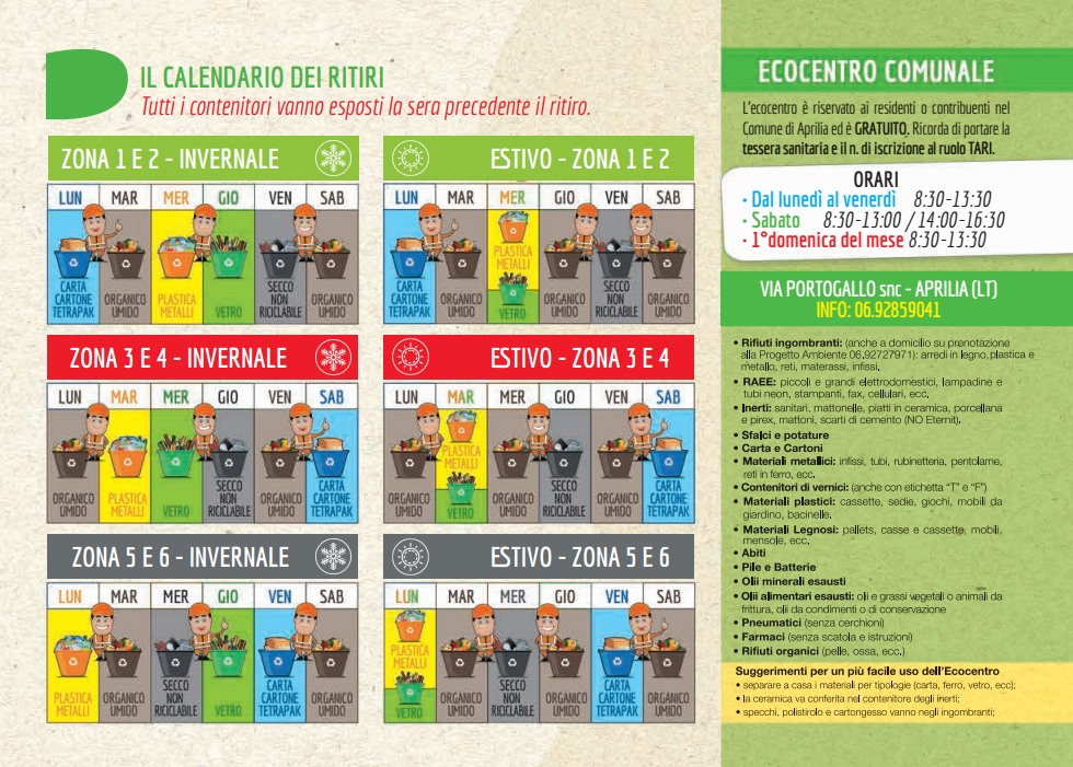 La sperimentazione riguarderà solo 2 delle 6 zone. Gli operatori impiegati saranno 14, suddivisi in 11 squadre di raccolta. Il territorio individuato per la prima fase di sperimentazione è quello identificato con le attuali Zona 1 e Zona 2, nelle quali risiedono 7426 nuclei familiari, per un totale di 17712 cittadini. (Zona 1: Fossignano, La Cogna, Casalazzara e via Riserva Nuova. Zona 2: Apriliana, Vallelata e Campoleone). In sostanza meno rifiuti indifferenziati vengono prodotti più salvaguardiamo il territorio. Con il passaggio alla tariffa puntuale i vantaggi sono molteplici:si rispettano gli obiettivi indicati dall’Unione Europea, si aumenta la percentuale di raccolta differenziata dei rifiuti e una sensibile riduzione dei costi di smaltimento, si riduce sempre più la quantità di rifiuti prodotti pro-capite, si consente un migliore monitoraggio del servizio offerto dal gestore.