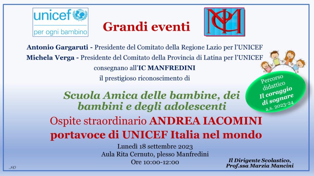Per l'Unicef Italia l’Istituto Manfredini di Pontinia è una “Scuola Amica delle bambine, dei bambini e degli adolescenti”