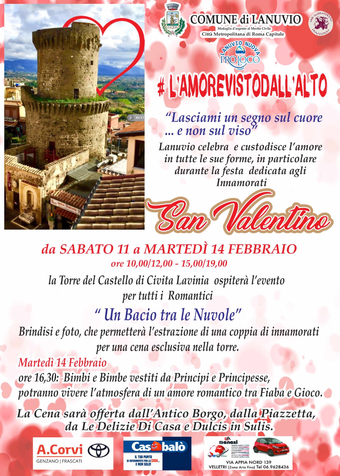 Durante l’evento di San Valentino “Un bacio tra le Nuvole”, che si svolgerà da Sabato 11 a Martedì 14 Febbraio, tutti gli innamorati, lanuvini e non, potranno salire sulla Torre del Castello di Civita Lavinia, aperta dalle 10 alle 12 e dalle 15 alle 19, per brindare insieme e immortalare il momento. Tra gli scatti raccolti verrà estratta una coppia di innamorati alla quale verrà offerta una cena esclusiva all’interno della Torre.