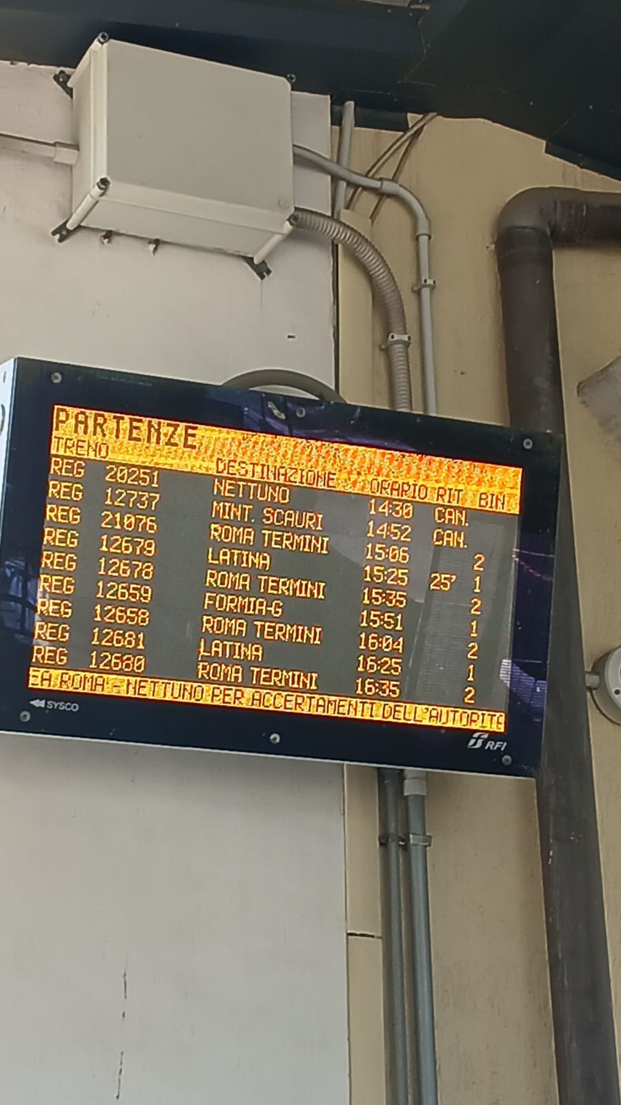 • IC 552 Reggio Di Calabria Centrale (7:56) - Roma Termini (15:34): il treno oggi è instradato sul percorso alternativo via Cassino e non ferma a Formia e Latina.