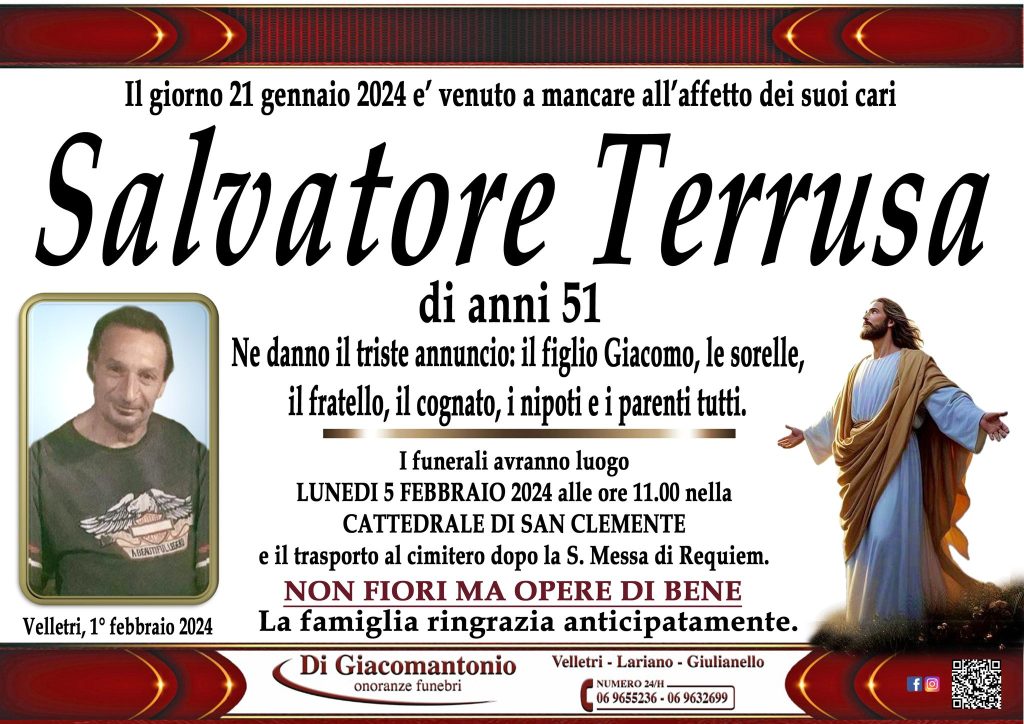 I funerali di Salvatore Terrusa sono stati fissati per questo lunedì 5 febbraio, alle 11.00, presso la Cattedrale San Clemente, a Velletri.