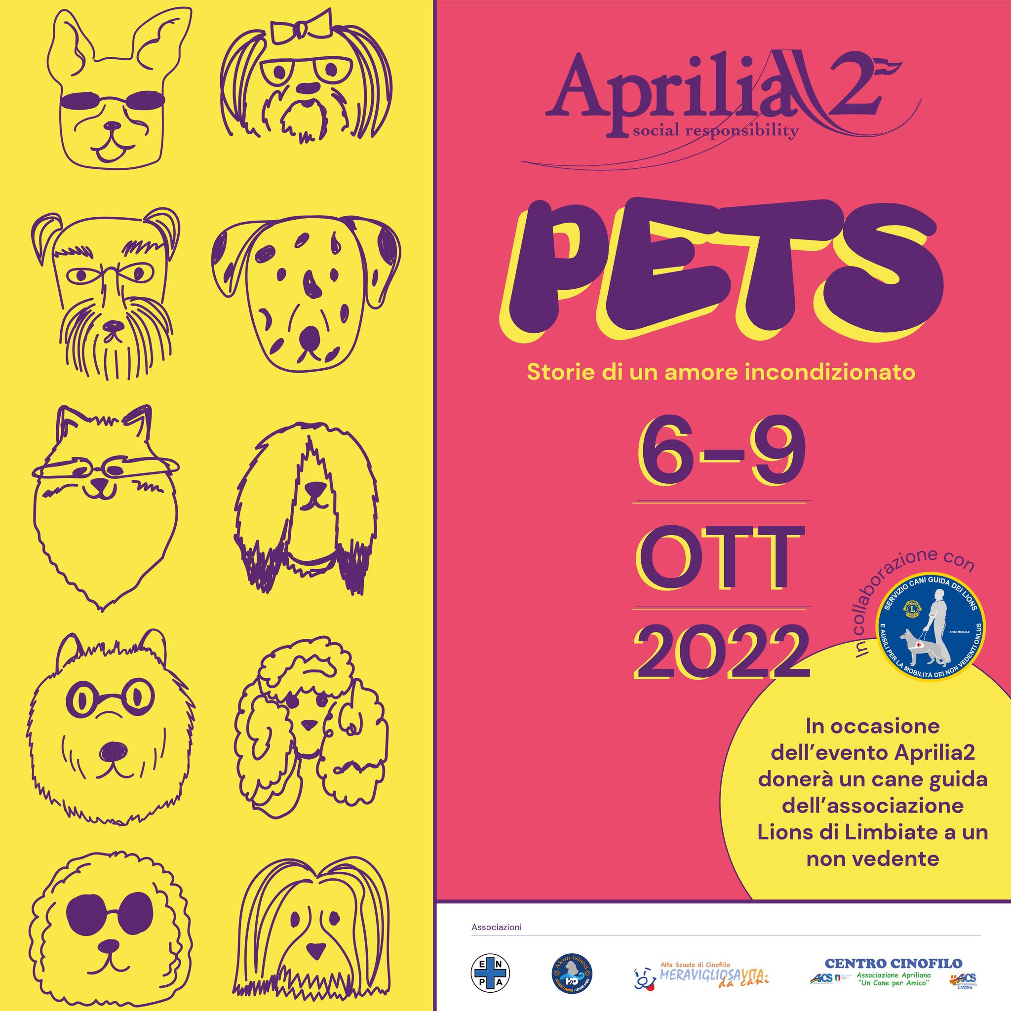 Da questa iniziativa nasce l’evento denominato “PETS - Storie di un amore incondizionato”, che vede il coinvolgimento dei Comuni, delle Autorità e degli Enti cittadini, nonché la partecipazione di molte associazioni quali, l’Associazione apriliana “Un cane per amico”, l’Associazione “Meravigliosa Vita da Cani”, l’Associazione AKUN ISLAND e l’ENPA.