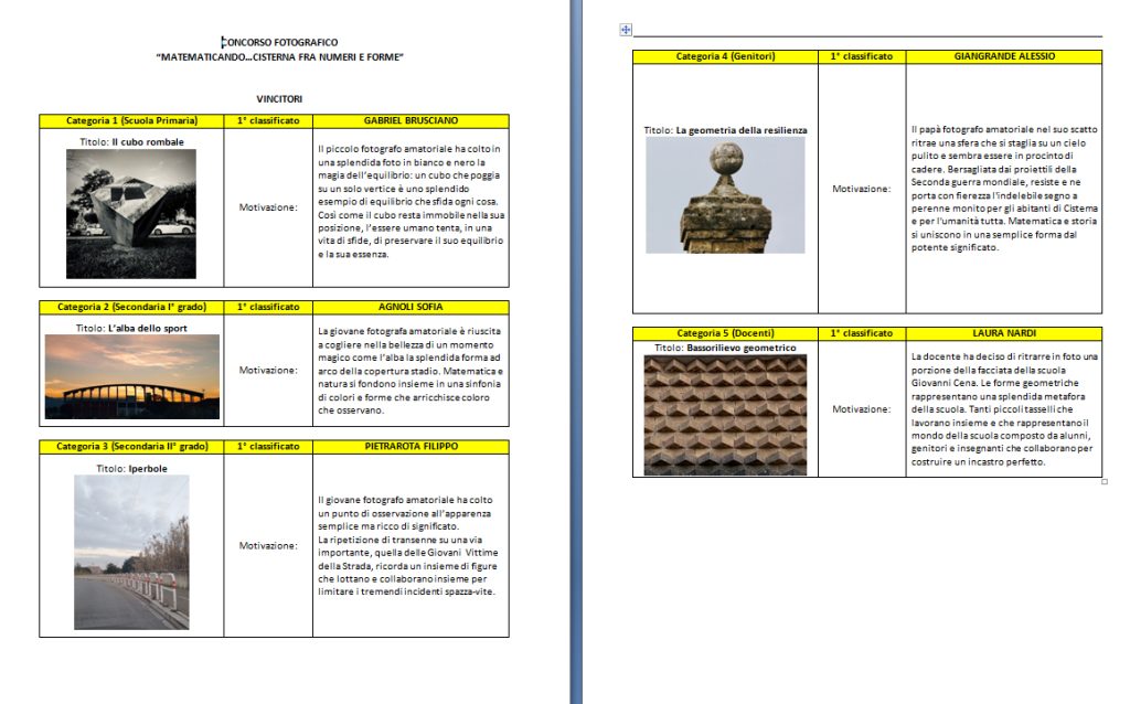 Sono risultati vincitori Gabriel Brusciano (categoria Scuola Primaria) con la foto "Il cubo rombale", Sofia Agnoli (cat. Secondaria I° grado) con la foto "L'alba dello sport", Filippo Pietrarota (cat. Secondaria II° grado) con "Iperbole", Alessio Giangrande (cat. Genitori) con "La geometria della resilienza", Laura Nardi (cat. docenti) con la foto "Bassorilievo geometrico".