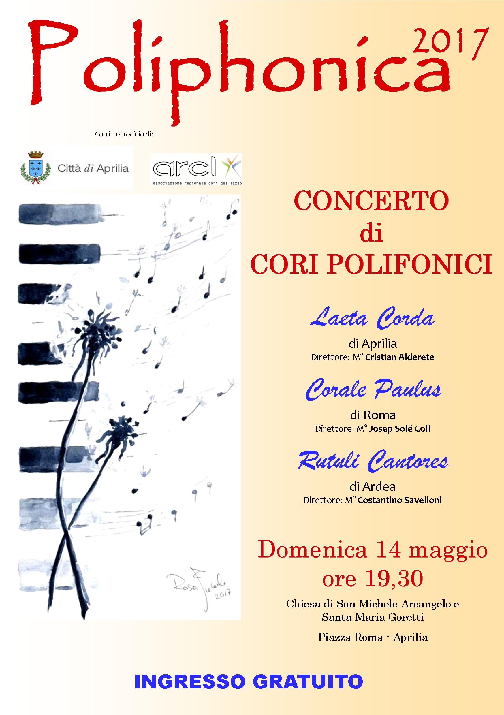 Dopo una pausa di tre anni dall'ultima manifestazione, ecco a voi "POLIPHONICA 2017". Il 14 Maggio 2017, alle ore 19,30, presso la Chiesa Arcipretale SS. Michele Arcangelo e Maria Goretti di Aprilia, si terrà la settima edizione della manifestazione musicale di cori “Poliphonica 2017” evento fiore all'occhiello dell'Associazione Culturale Coro Laeta Corda, curata in ogni aspetto organizzativo.