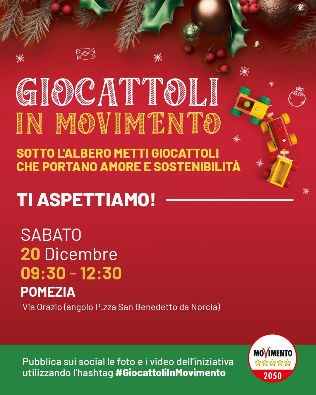 Pomezia, “Giocattoli in Movimento” per un Natale più solidale e sostenibile. La sezione locale del Movimento 5 Stelle ha organizzato per sabato 20 dicembre un’iniziativa nella zona del Mercato, in via Orazio, all’angolo con Piazza San Benedetto. dalle 9.30 alle 12.30 si raccoglieranno giocattoli e libri usati, ma che siano in ottimo stato, dando loro nuova vita e permettendo ad altri bambini di ricevere un regalo. I materiali raccolti saranno donati a reparti pediatrici, case famiglia e strutture per l’infanzia.