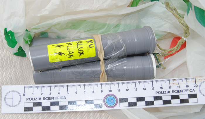 La perquisizione domiciliare eseguita nel corso delle investigazioni e disposta dalla locale Autorità Giudiziaria, permetteva di rinvenire a casa di entrambi varie armi da punta e taglio, materiale propagandistico delle ideologie neonaziste e razziste, nonché un ordigno artigianale con potenzialità micidiali.