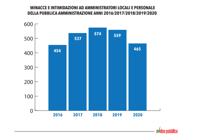 Sono 465 gli atti intimidatori, di minaccia e violenza rivolti nel 2020 contro sindaci, assessori, consiglieri comunali e municipali, amministratori regionali, dipendenti della Pubblica Amministrazione (-17% rispetto al 2019, quando furono 559), registrati da Avviso Pubblico attraverso il monitoraggio delle notizie di stampa locali e nazionali, delle interrogazioni parlamentari e raccogliendo le segnalazioni dei propri coordinamenti territoriali. Una media di 9 intimidazioni a settimana, una minaccia ogni 19 ore.
