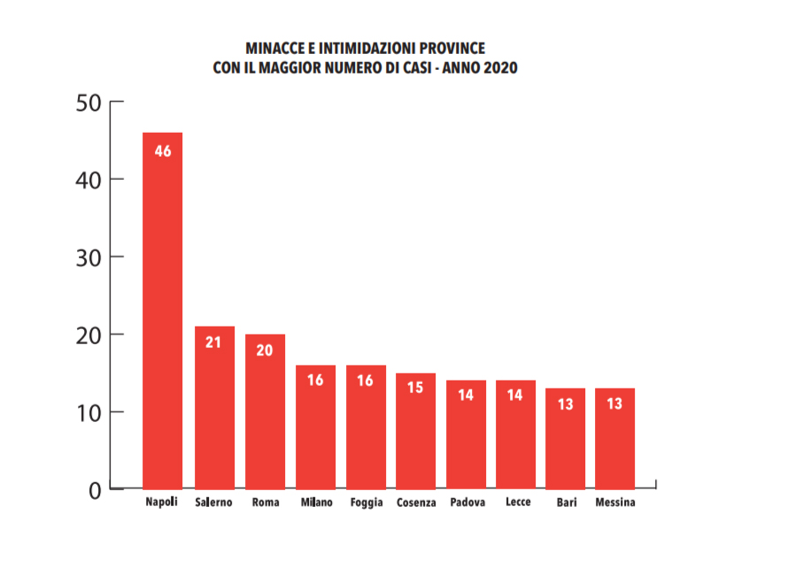 Per il quarto anno consecutivo è la Campania a far registrare il maggior numero di intimidazioni a livello nazionale, con 85 casi censiti (furono 92 nel 2019). Seguono appaiate Puglia e Sicilia con 55 atti intimidatori, che fanno segnare un evidente calo rispetto al 2019, rispettivamente del 23 e del 17 per cento. In discesa anche la Calabria (38 casi rispetto ai 53 del 2019), che prosegue un trend iniziato da alcuni anni. La Lombardia si conferma la regione più colpita del Nord Italia (37 casi, nove in meno del 2019), seguita dal Lazio (36 casi, stabile). Chiudono le prime 10 posizioni Veneto (30 casi, uno dei pochi territori in aumento), Emilia-Romagna