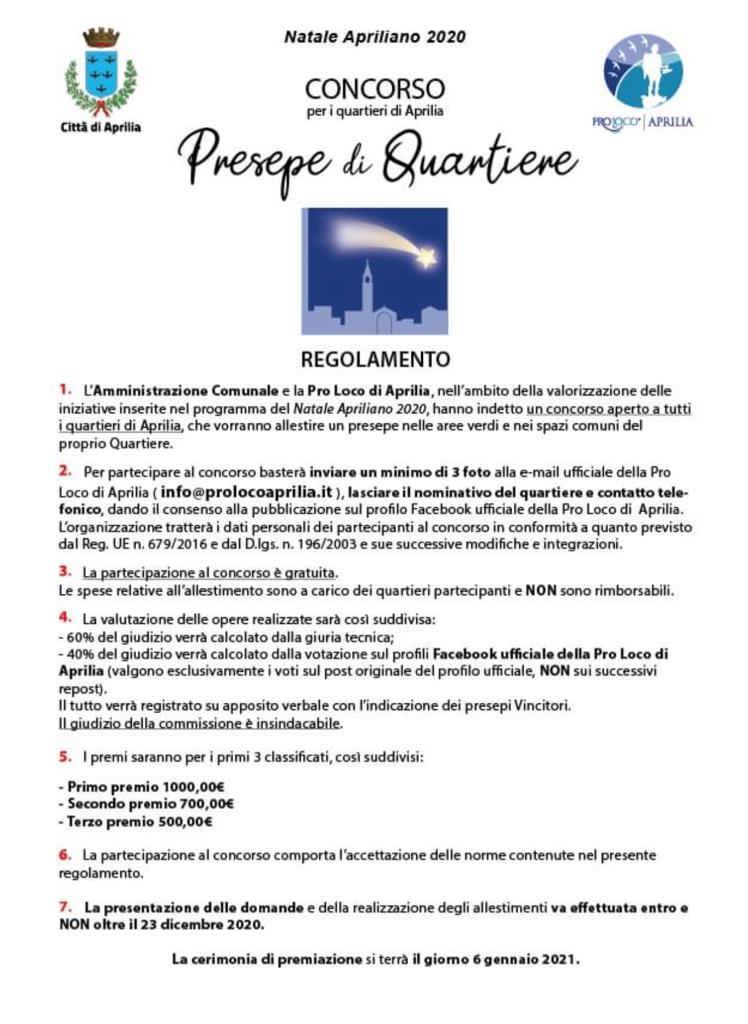 Quale sarà il presepe più bello ad Aprilia? Lo stabilirà un concorso indetto dal Comune e che coinvolgerà i comitati di quartiere che vorranno aderire. Basterà inviare 3 foto del presepe di quartiere e poi scatenarsi con le votazioni. I vincitori saranno decretati da una giuria tecnica e dai like ottenuti sulla pagina della Pro Loco. Saranno premiati i primi 3 classificati: primo premio 1000 euro, secondo 700 euro e il terzo è di 500 euro.