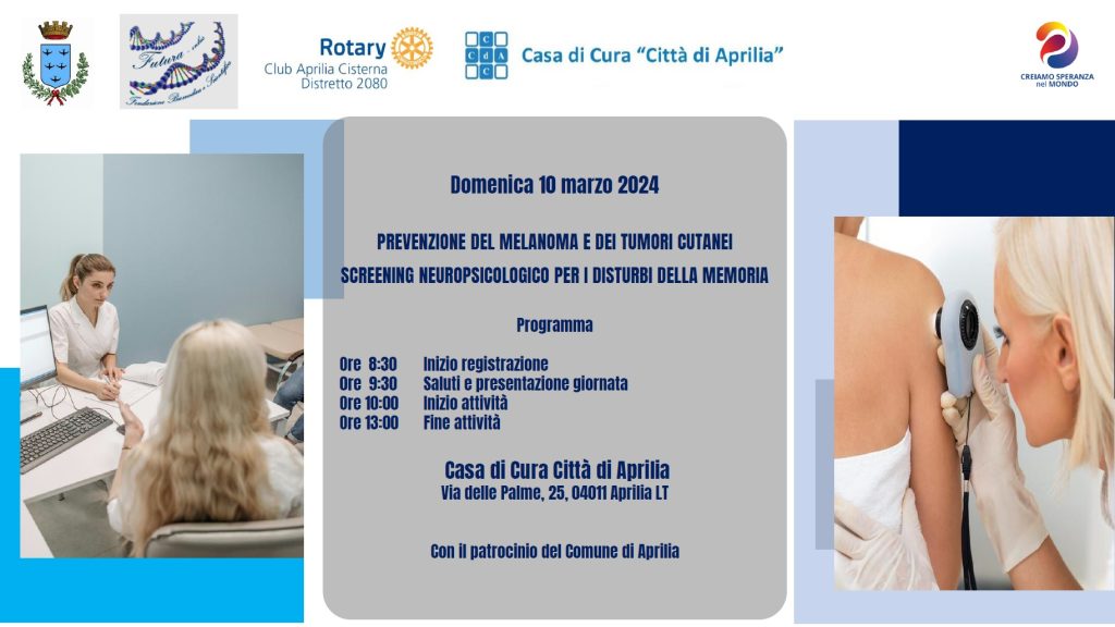 Al via la nuova campagna gratuita finalizzata alla prevenzione del melanoma e dei tumori cutanei e lo screening neuropsicologico per i disturbi della memoria, a cura del “Rotary Club Aprilia Cisterna”.