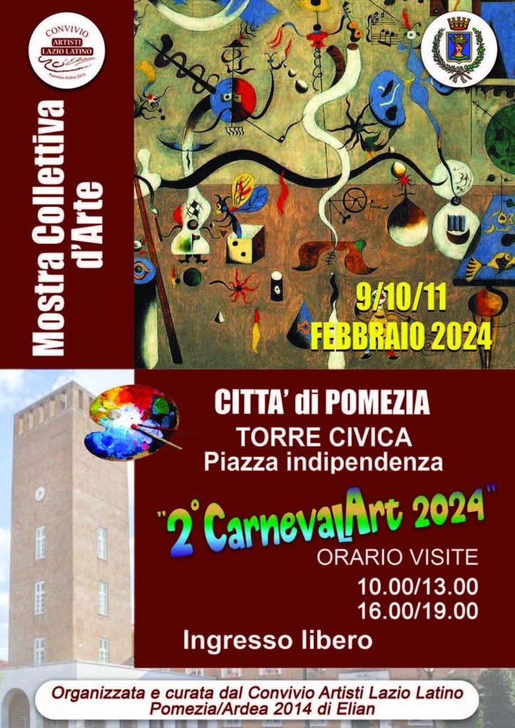 In occasione del Carnevale, presso la Torre Civica di piazza Indipendenza, da oggi a domenica 11 febbraio si può, inoltre, visitare la mostra d’arte denominata “II CARNEVAL ART 2024”. Si tratta di una mostra collettiva, organizzata dal Convivio Artisti Lazio Latino Pomezia/Ardea di Elian, e che propone rappresentazioni artistiche riferite al Carnevale.