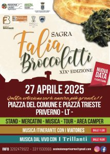 Torna questa domenica 27 aprile a Priverno la Sagra Falia e Broccoletti. Cuore della manifestazione sarà la Piazza del Comune, animata dalle 10 del mattino e fino sera anche con musica popolare, visite guidate, mercatini dell’artigianato, raduno di moto d’epoca, spettacoli teatrali, animazione per bambini.