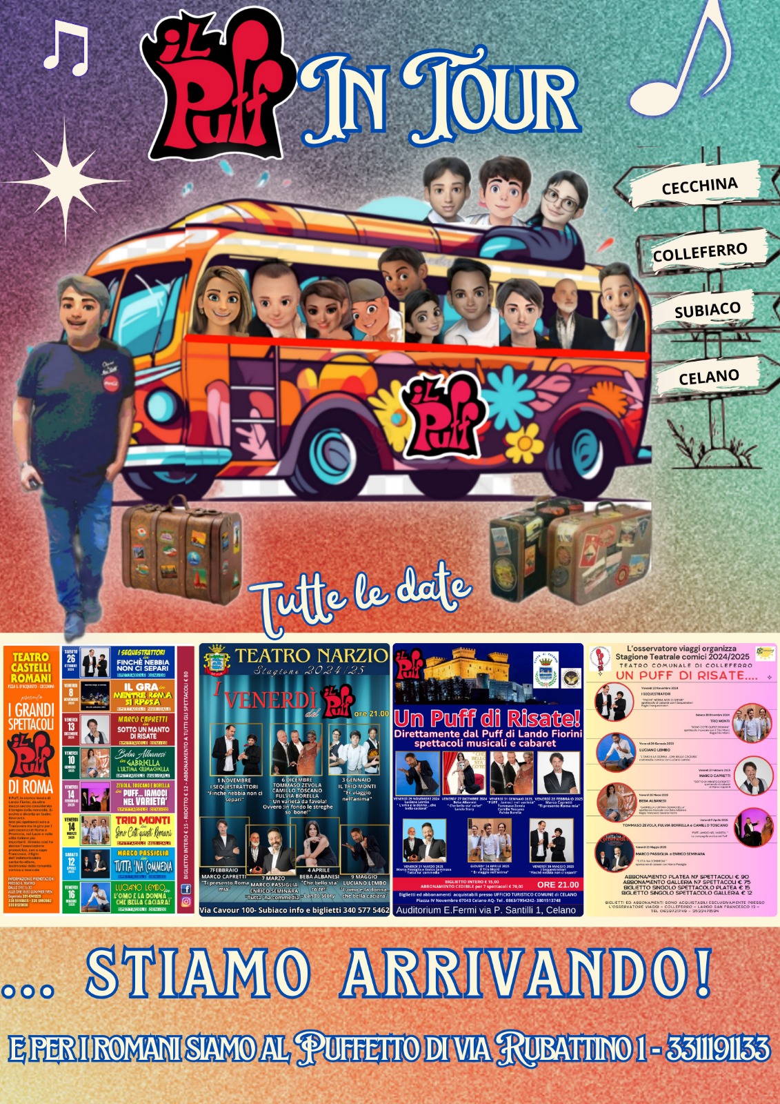 “Puff in Tour”, si apre ai Castelli Romani la rassegna teatrale dell’associazione “Lando Fiorini” per promuovere la romanità. I migliori comici della scuderia “Lando Fiorini”, dal cuore della Capitale, calcheranno i palchi dei teatri del Lazio e dell’Abruzzo. La rassegna prende il via sabato 26 Ottobre dal “Teatro Castelli Romani” di Cecchina, ad Albano.