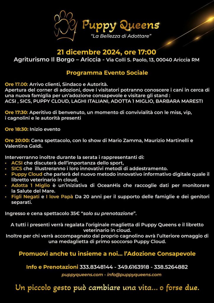 Puppy Queens, la bellezza di adottare. E’ l’evento che si svolge sabato 21 Dicembre all’agriturismo il borgo di Ariccia, in via Colli San Paolo 13.
