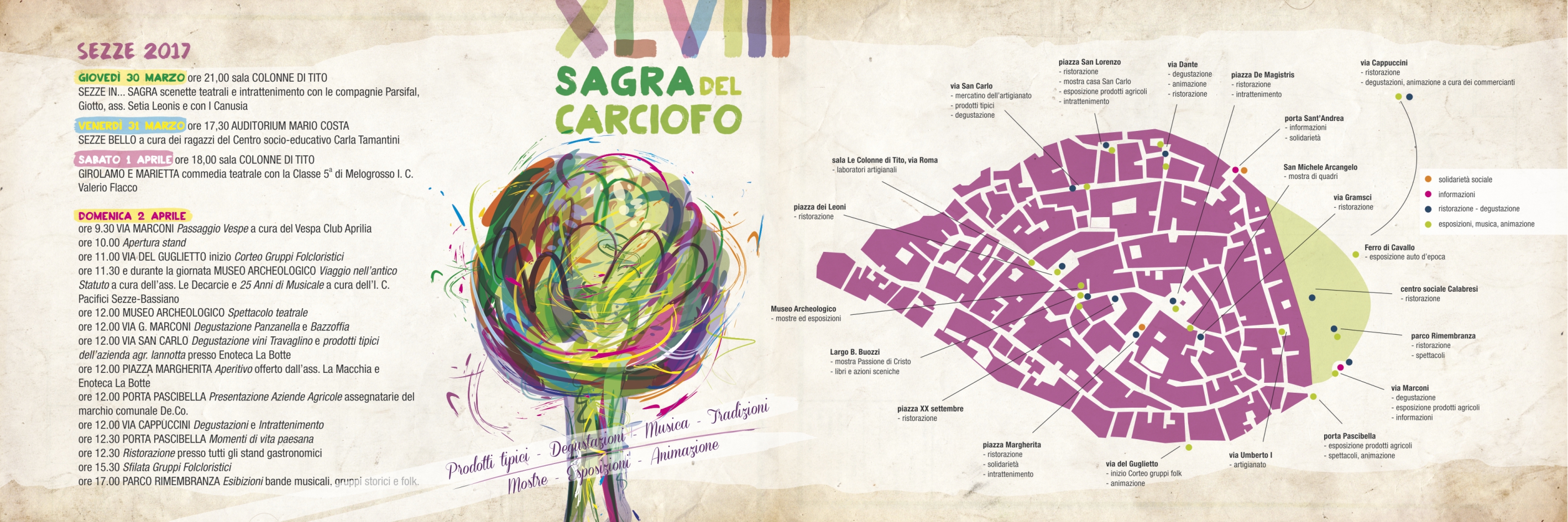 Domenica 2 aprile, invece, sarà il momento clou della Sagra del Carciofo, giornata in cui associazioni culturali, istituzioni scolastiche, produttori agricoli, ristoratori, commercianti e cittadini insieme al Comune di Sezze daranno vita ad una grande kermesse capace di valorizzare e promuovere le bellezze della città.