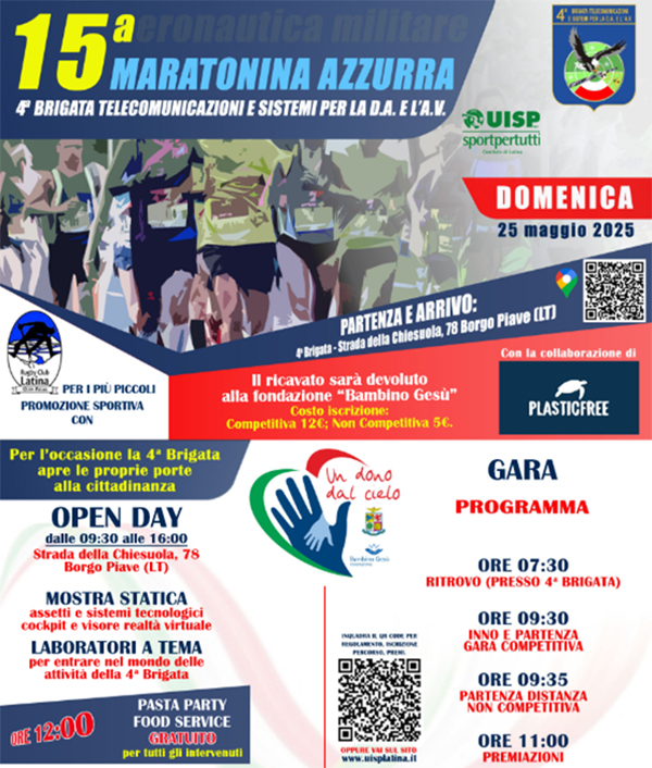 Questa domenica a Borgo Piave, a Latina, la “Maratonina Azzurra”, giunta alla sua 15esima edizione: si torna a correre con l’Aeronautica Militare. Lo start alle 9.30 e poi il traguardo nella sede della 4a Brigata, a Borgo Piave. Il percorso di 11 km attraverserà Piazza del Popolo, nel centro di Latina. Sono previste anche una non competitiva ed un open day con simulatori, mostra statica e free food.