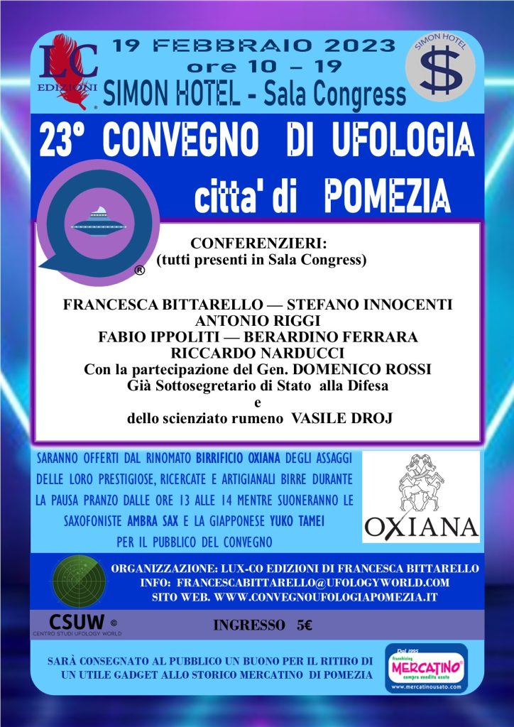 Domenica 19 febbraio a Pomezia, al Simon Hotel, ci un sarà un convegno di ufologia, con ospiti quotati relatori. Per la prima volta sarà presente lo scienziato rumeno Vasile Droj, che consigliò Papa Wojtyla.